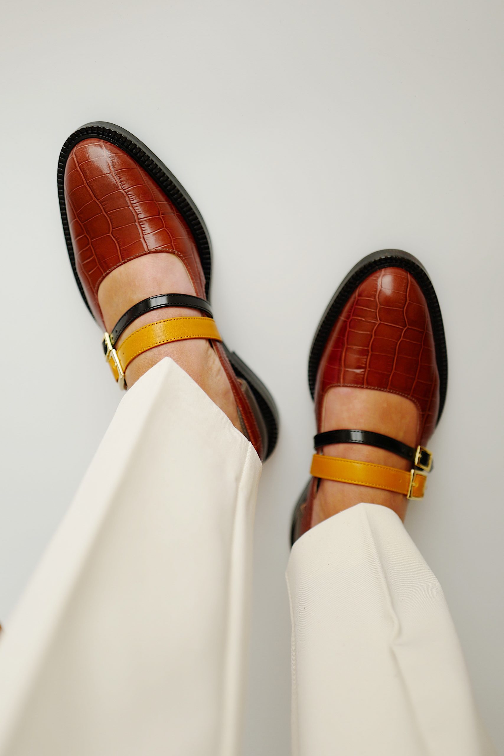 Stylish and modern double buckle closed toe sandals. These sleek and fascinating s urban sandals from INCH2 feature a flat sole, a branded insole, three tone lining with croco style round toe, mustard and black double buckles fastening.