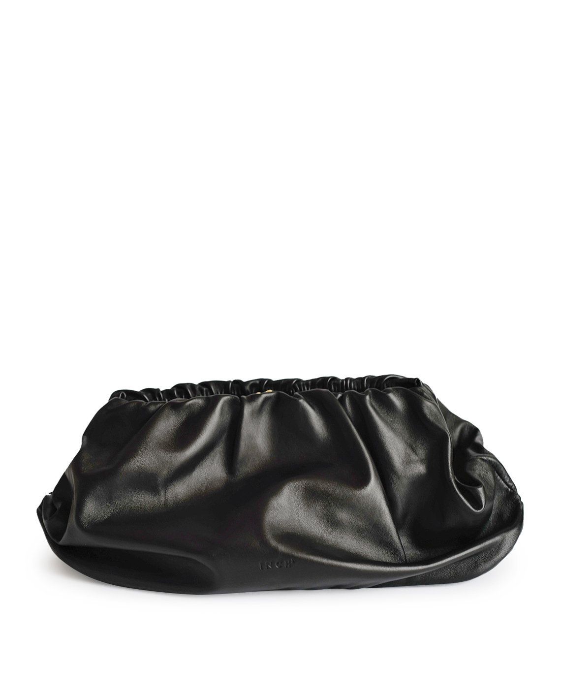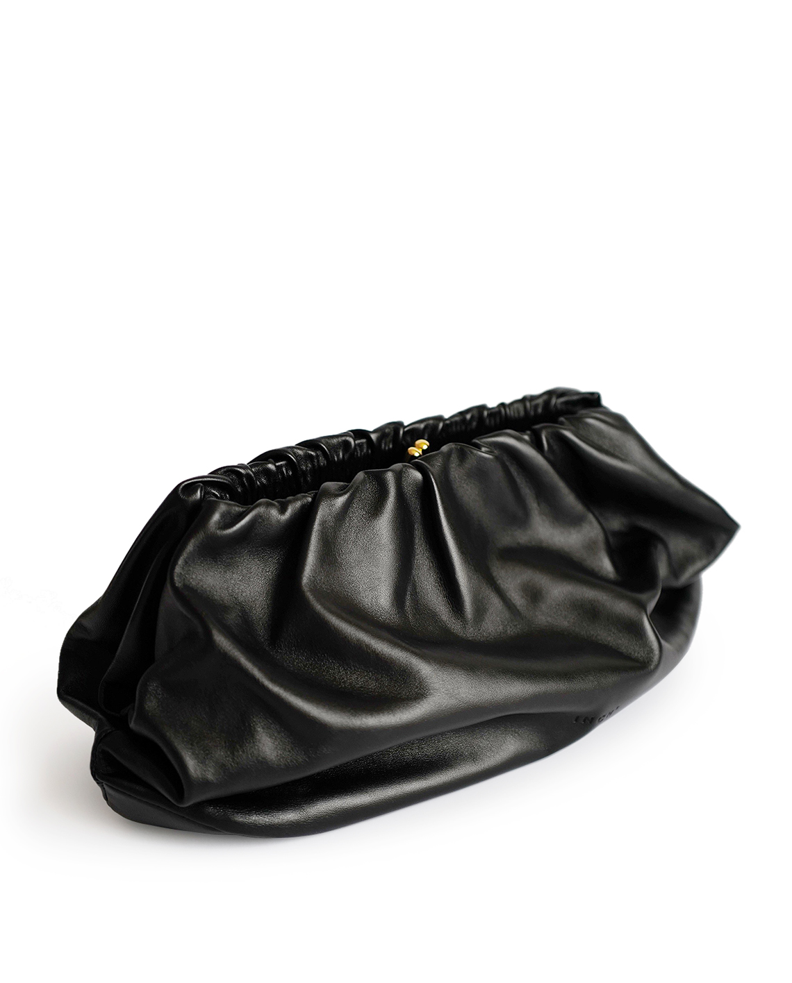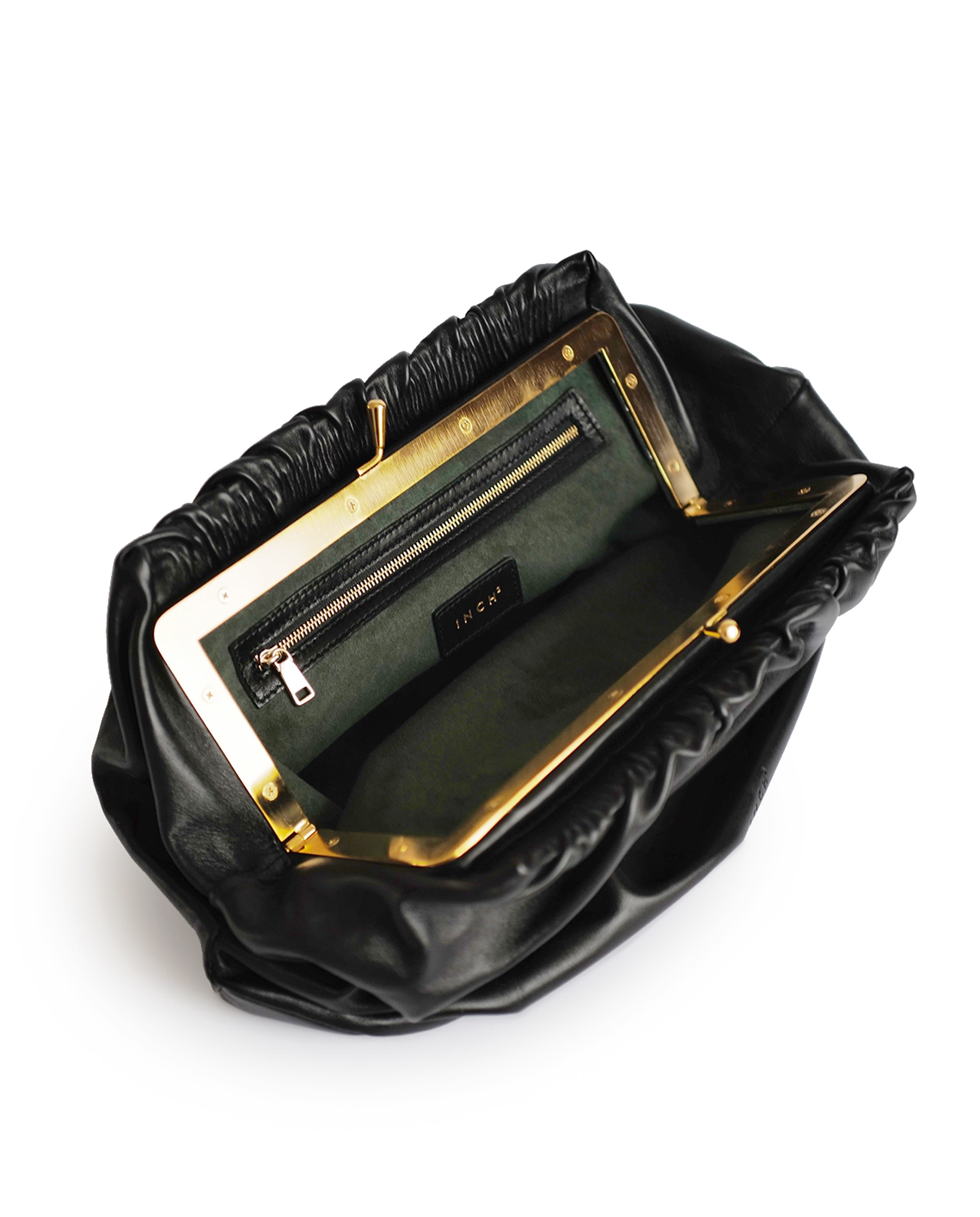 Black bag made of soft leather, a convenient inside pocket with a zipper, a lining from dark green velvet and gold accessories in vintage style. Run in the form of an oversized clutch with elegant folds that create the effect of clouds and zero gravity.