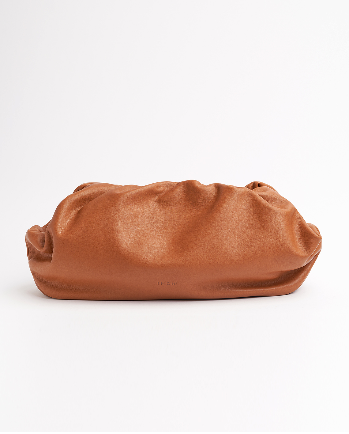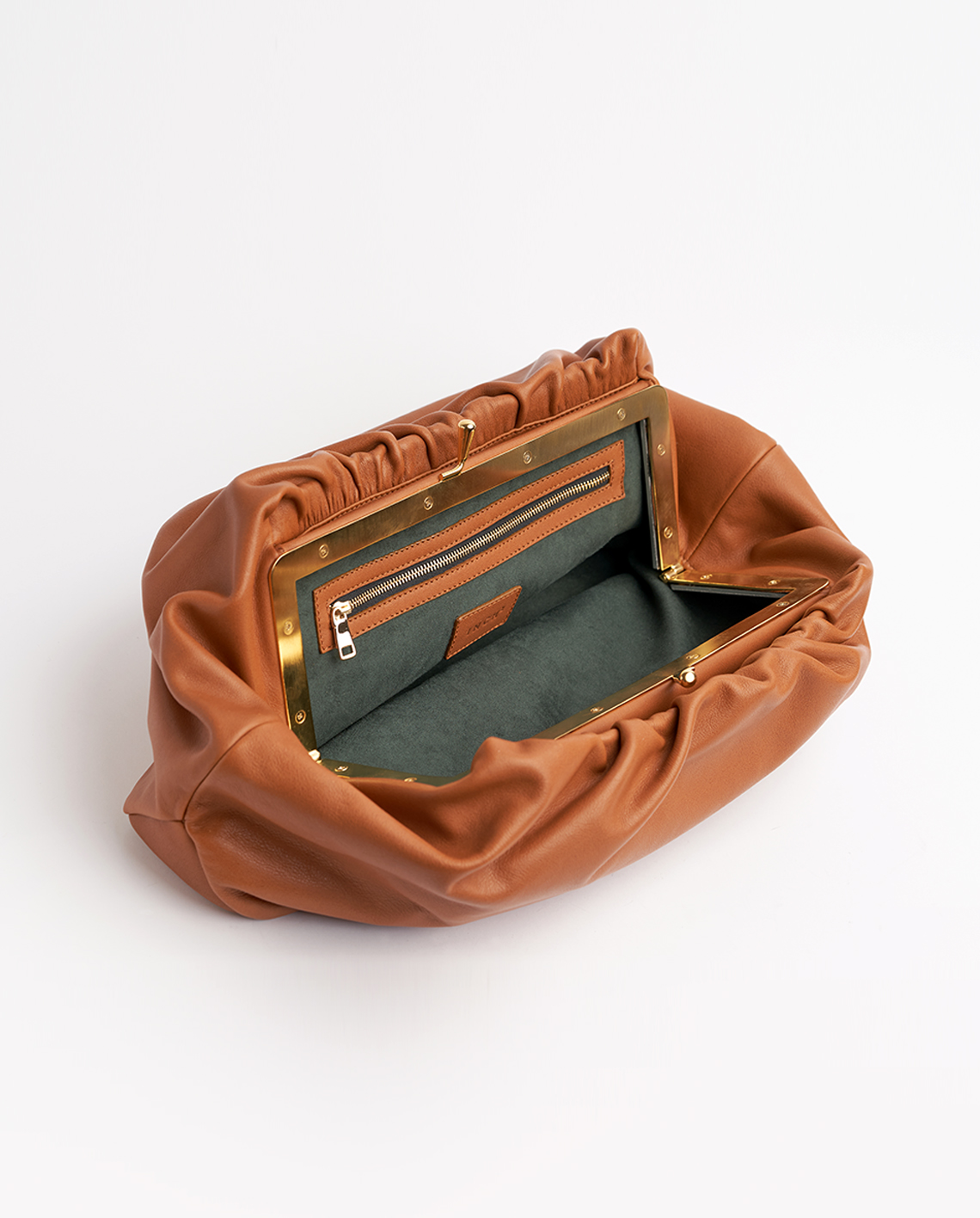 Pochette bag made of soft leather, a convenient inside pocket with a zipper, a lining from dark green velvet and gold accessories in vintage style. Run in the form of an oversized clutch with elegant folds that create the effect of clouds and zero gravity.