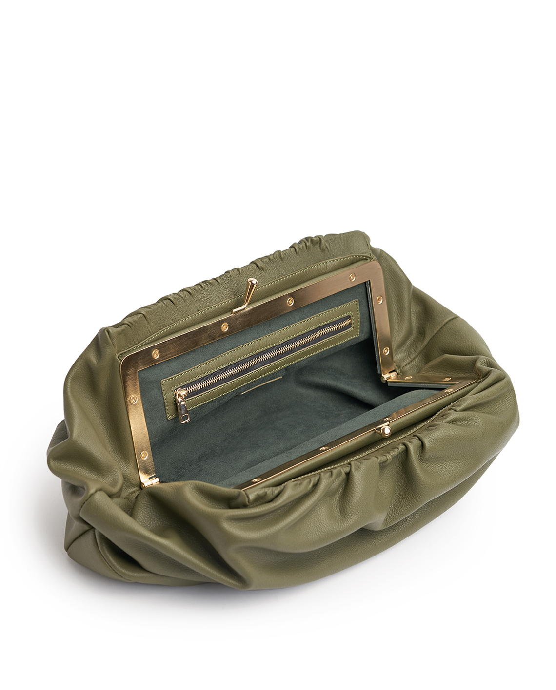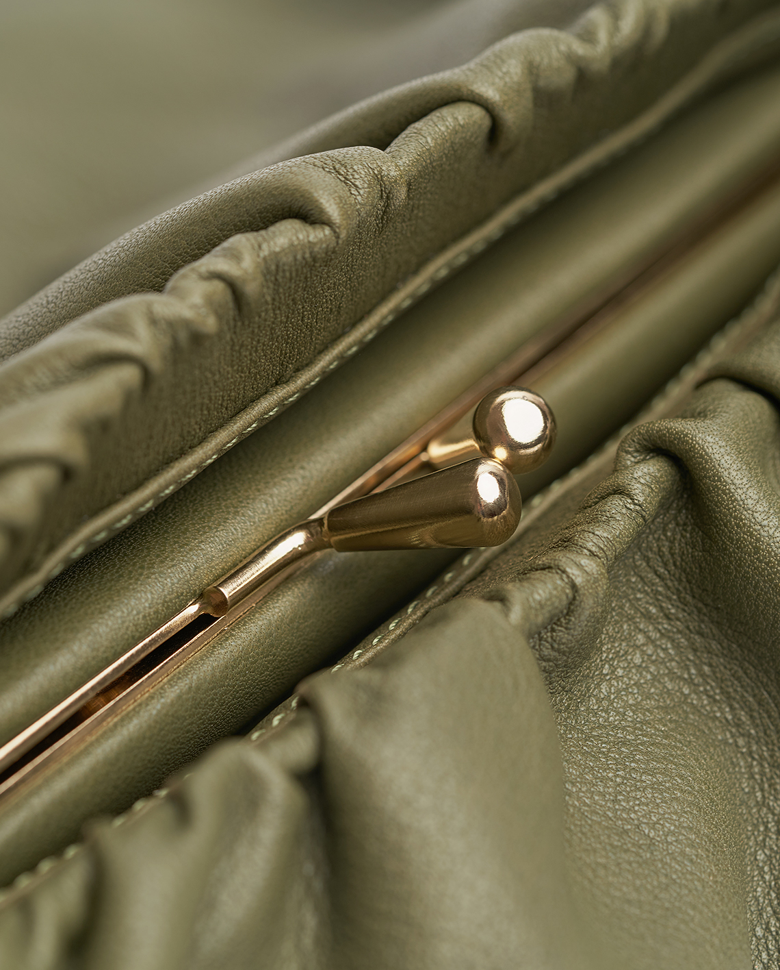 Pochette bag made of soft leather, a convenient inside pocket with a zipper, a lining from dark green velvet and gold accessories in vintage style. Run in the form of an oversized clutch with elegant folds that create the effect of clouds and zero gravity.