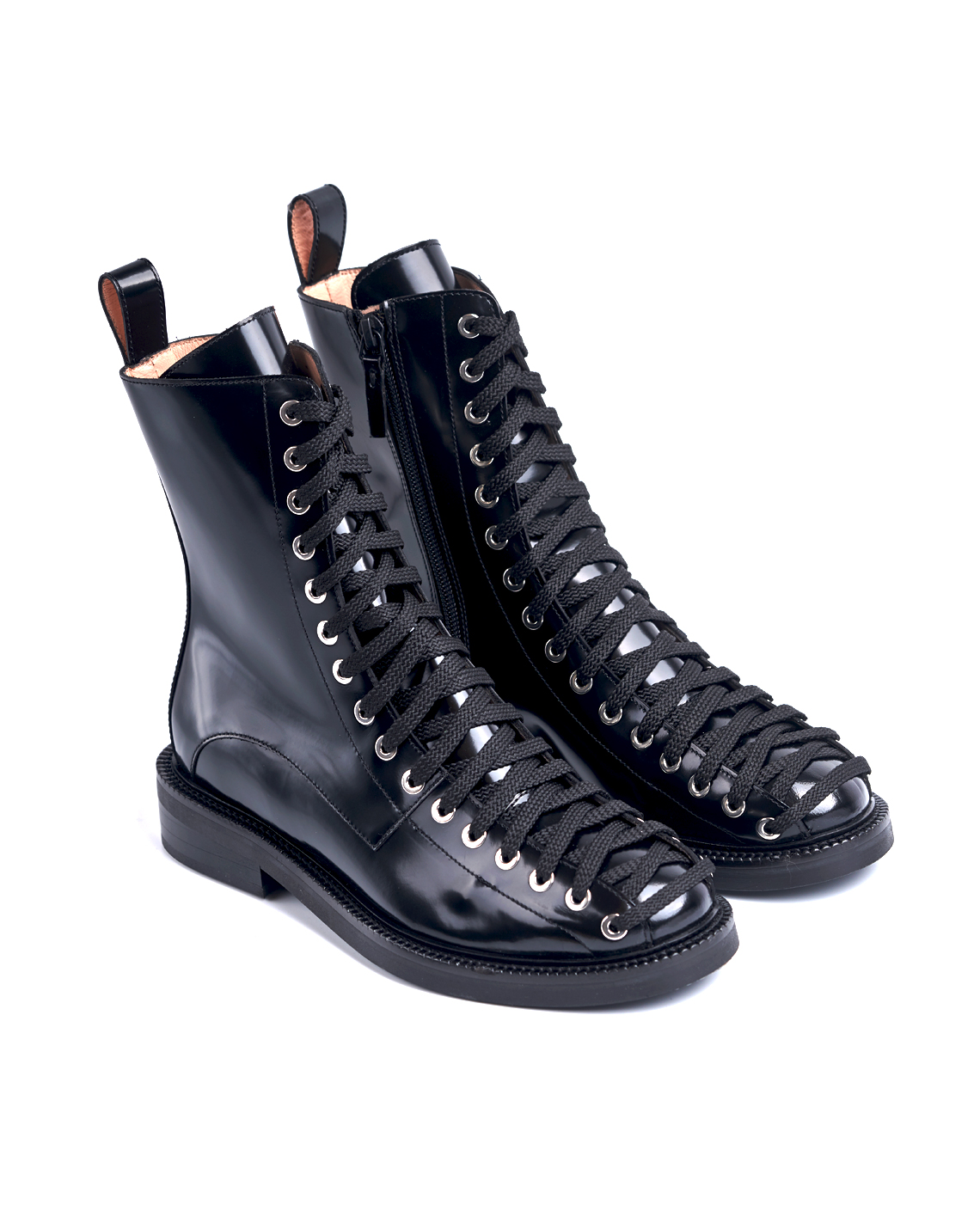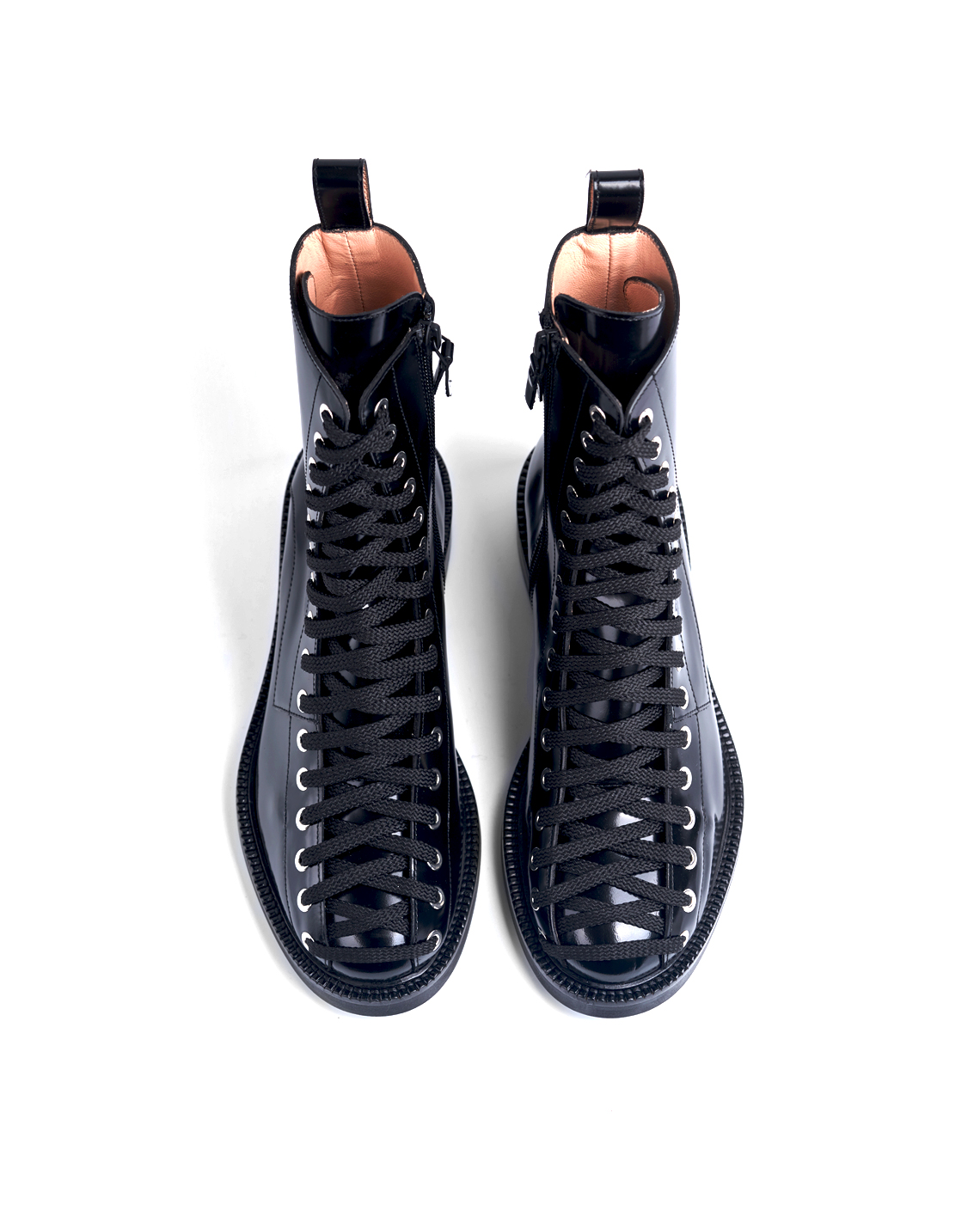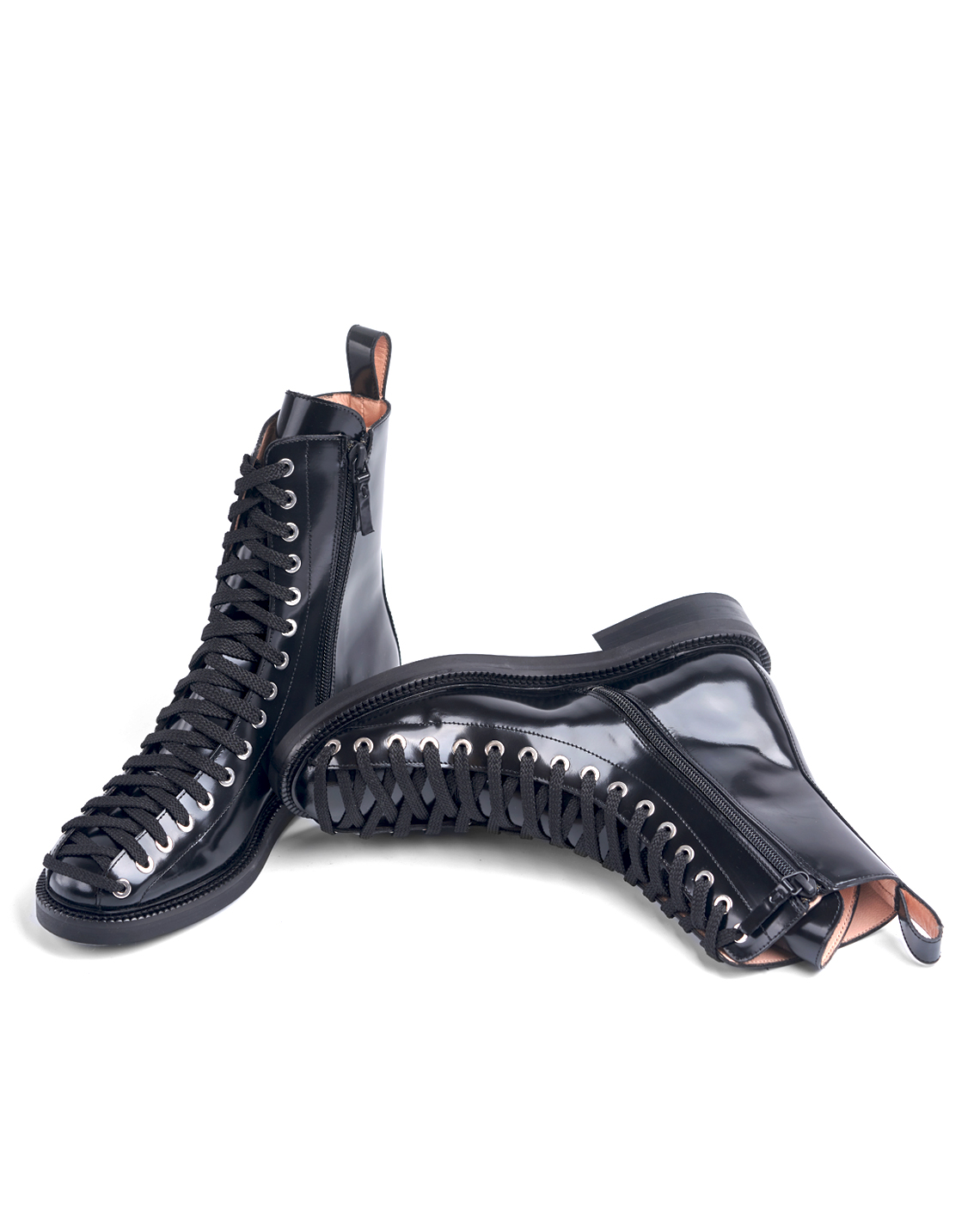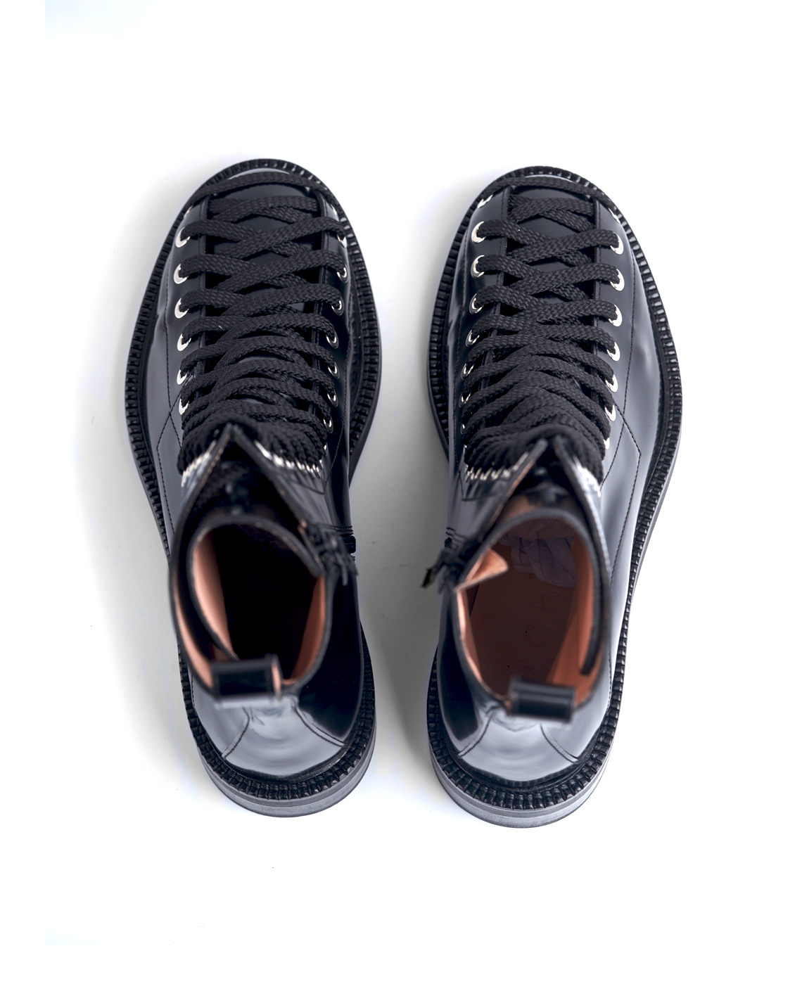 This pair is made in Portugal from black leather that’s been polished to a gleaming gloss. They have a platform sole and a handy zip along the side so there’s no need to disturb the laces.