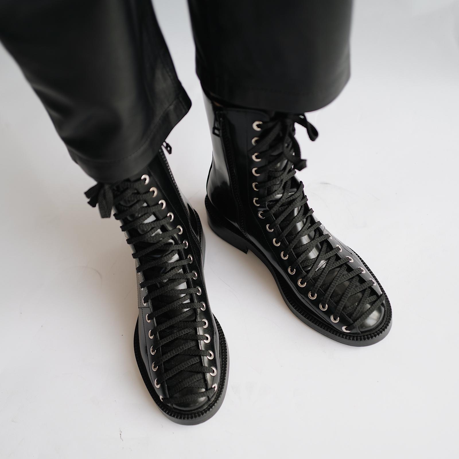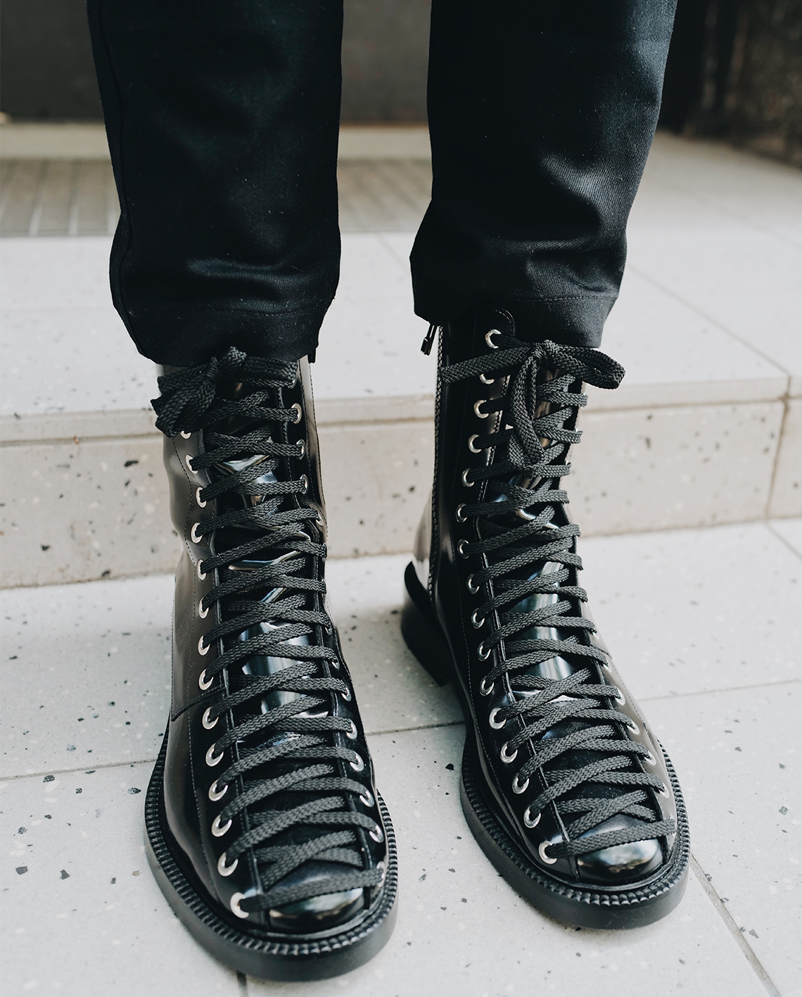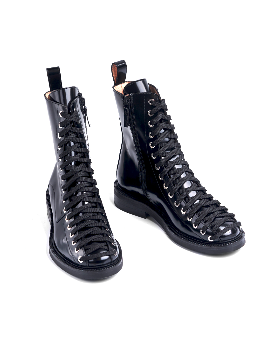 This pair is made in Portugal from black leather that’s been polished to a gleaming gloss. They have a platform sole and a handy zip along the side so there’s no need to disturb the laces.