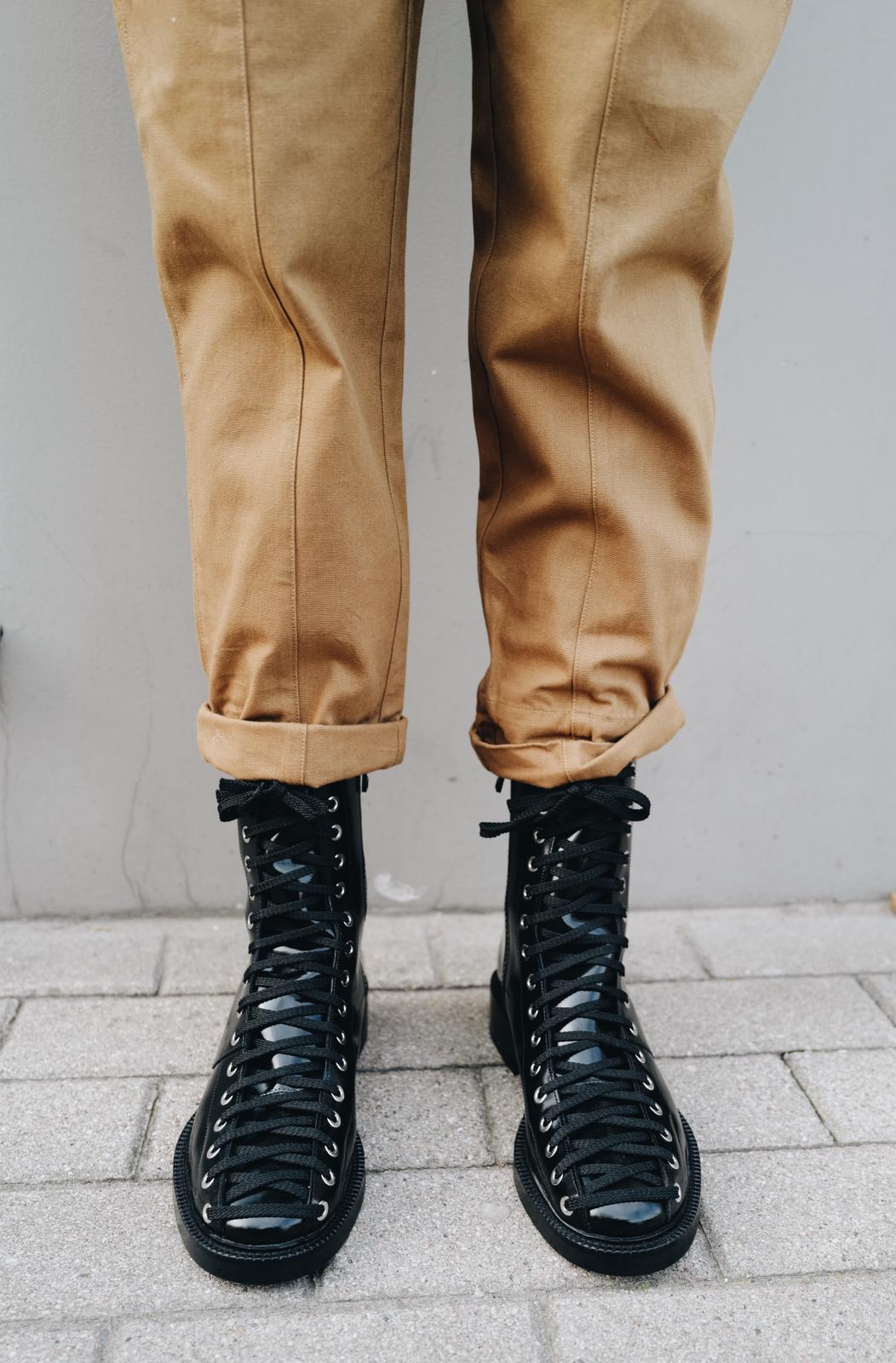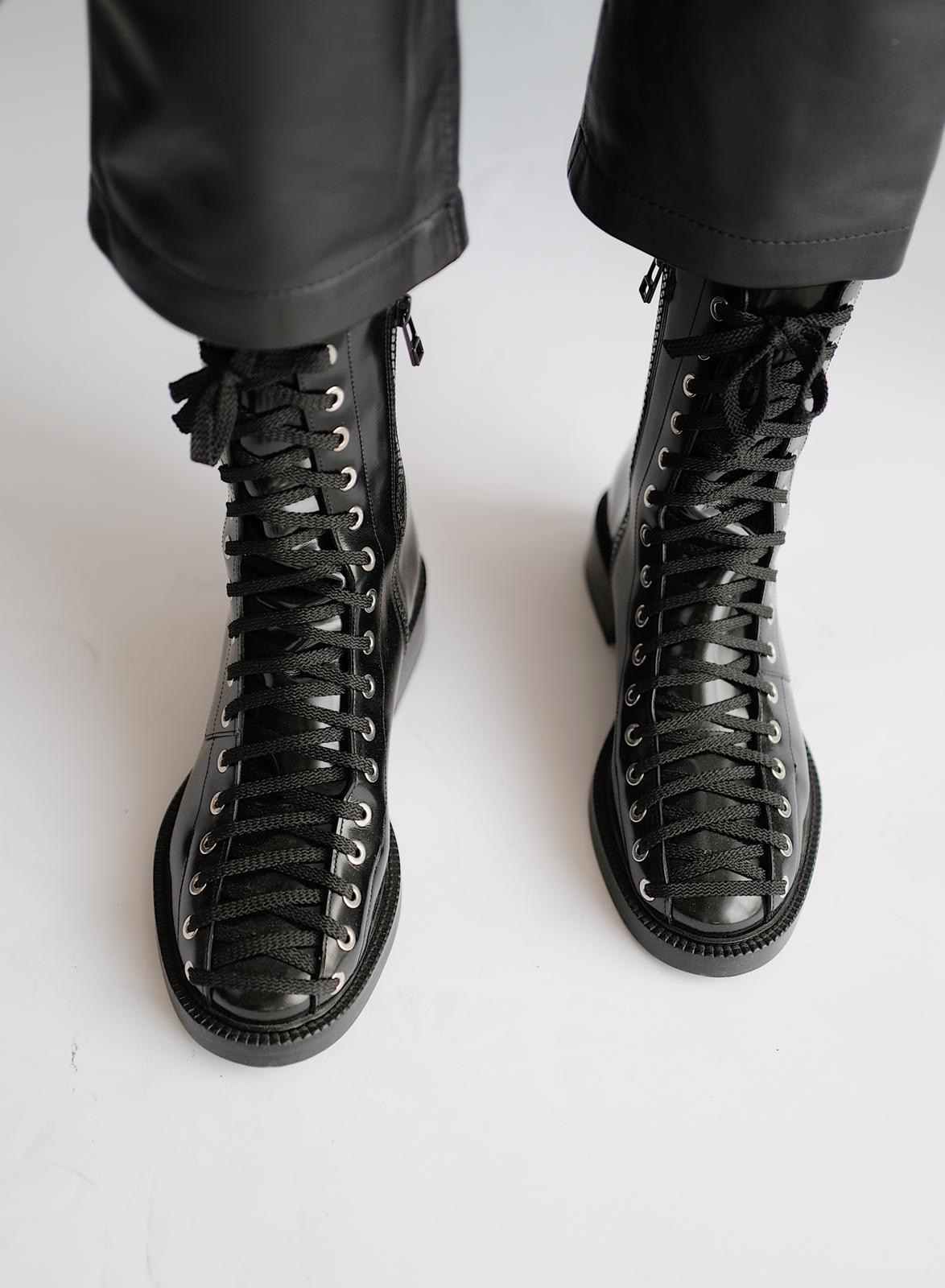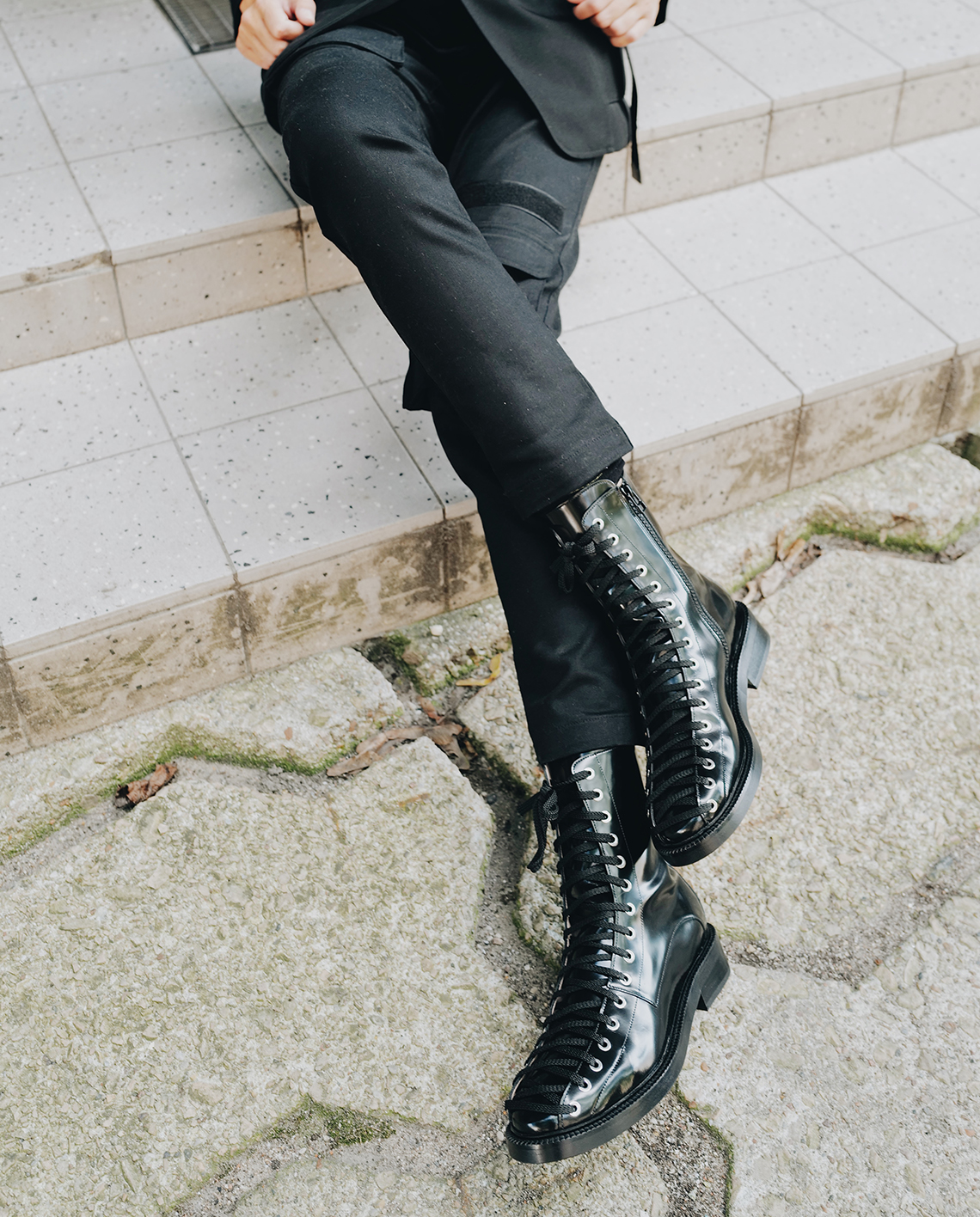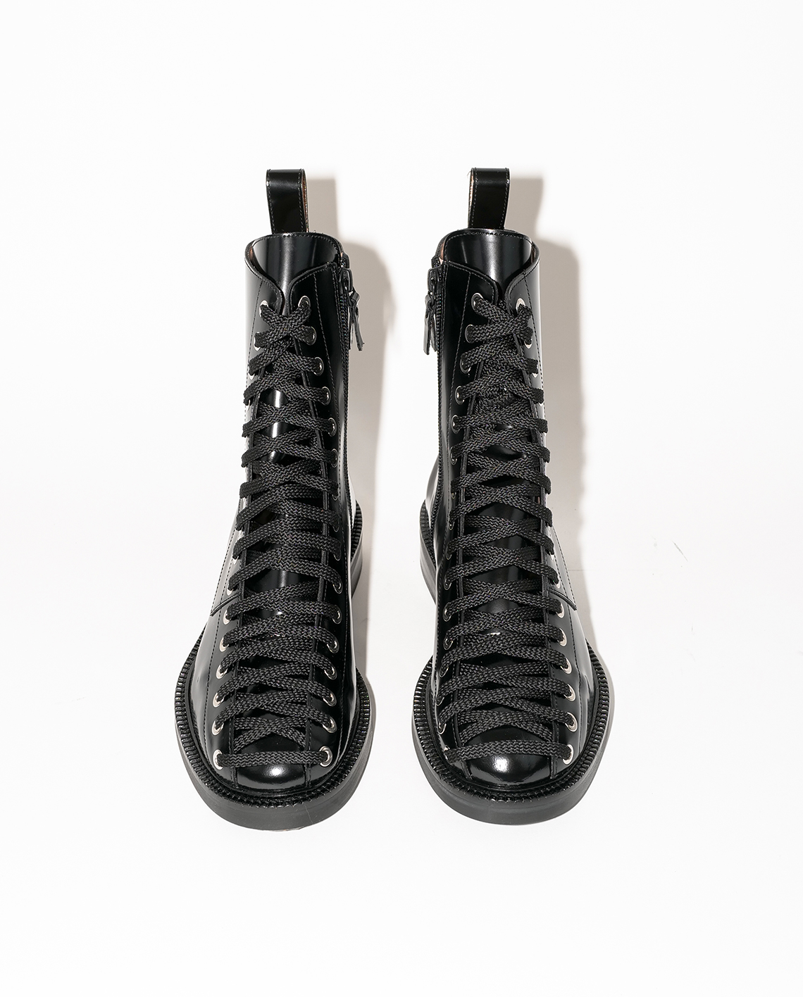 This pair is made in Portugal from black leather that’s been polished to a gleaming gloss. They have a platform sole and a handy zip along the side so there’s no need to disturb the laces.