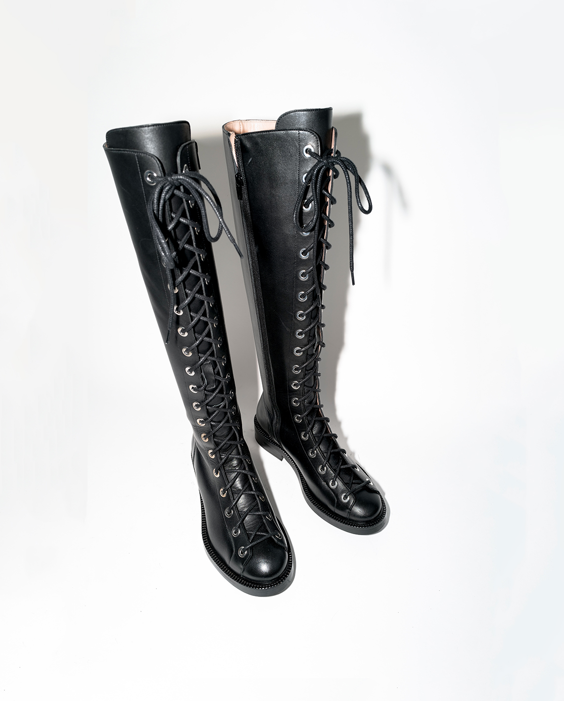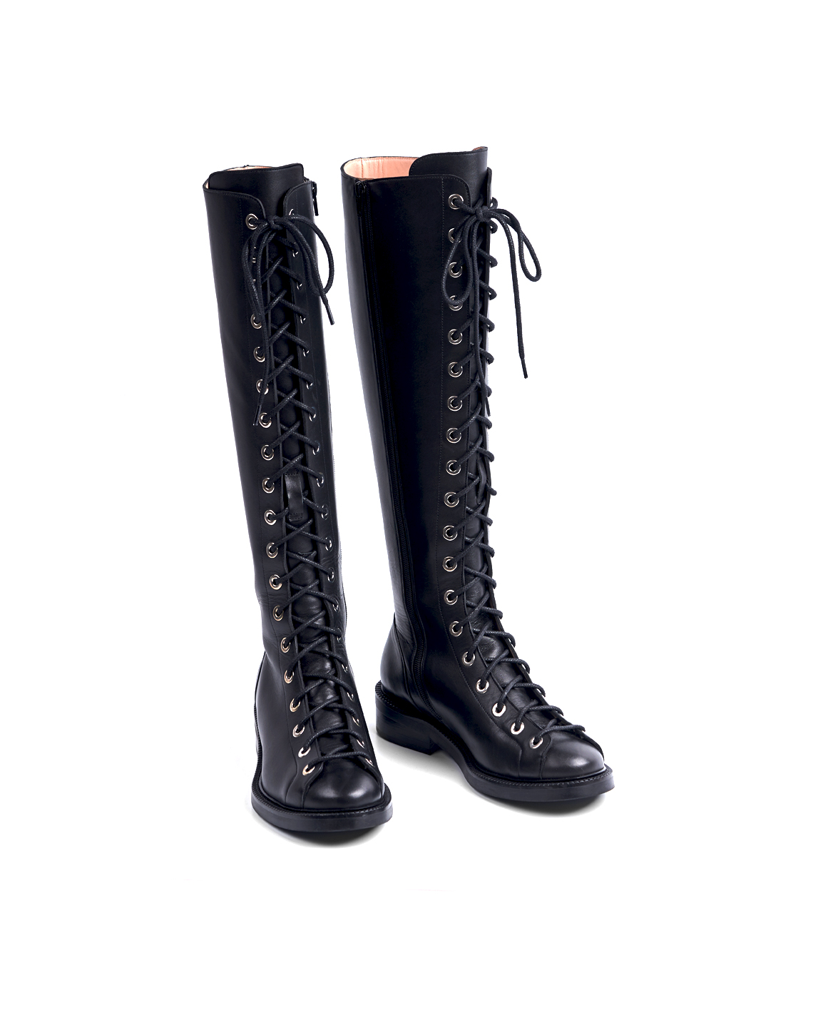This knee-high pair is made in Portugal from black soft leather. These High Boots have a platform sole and a handy zip along the side so there’s no need to disturb the laces.