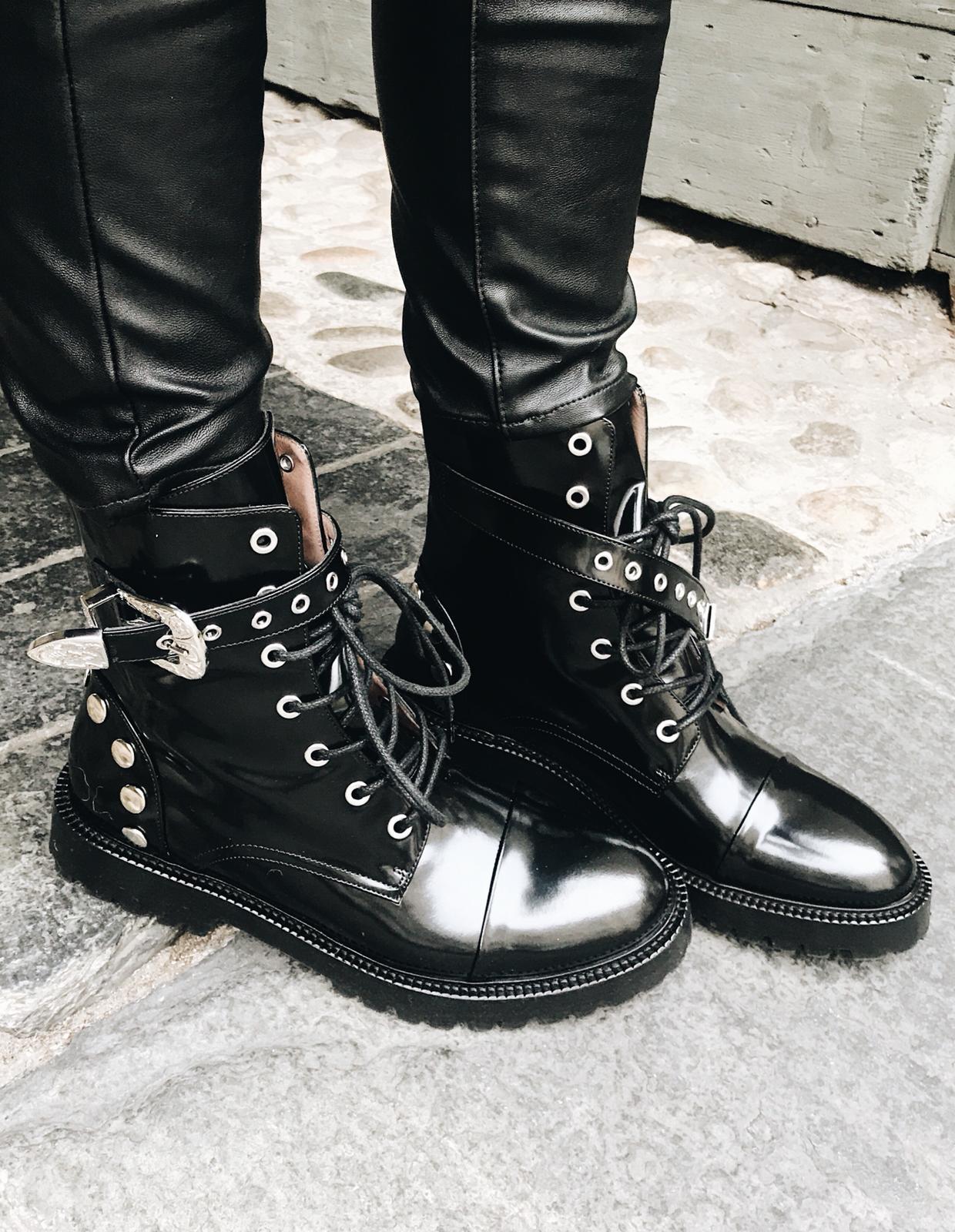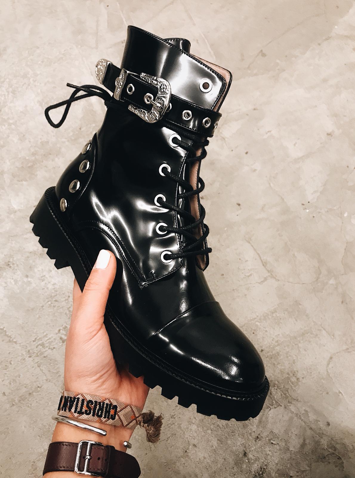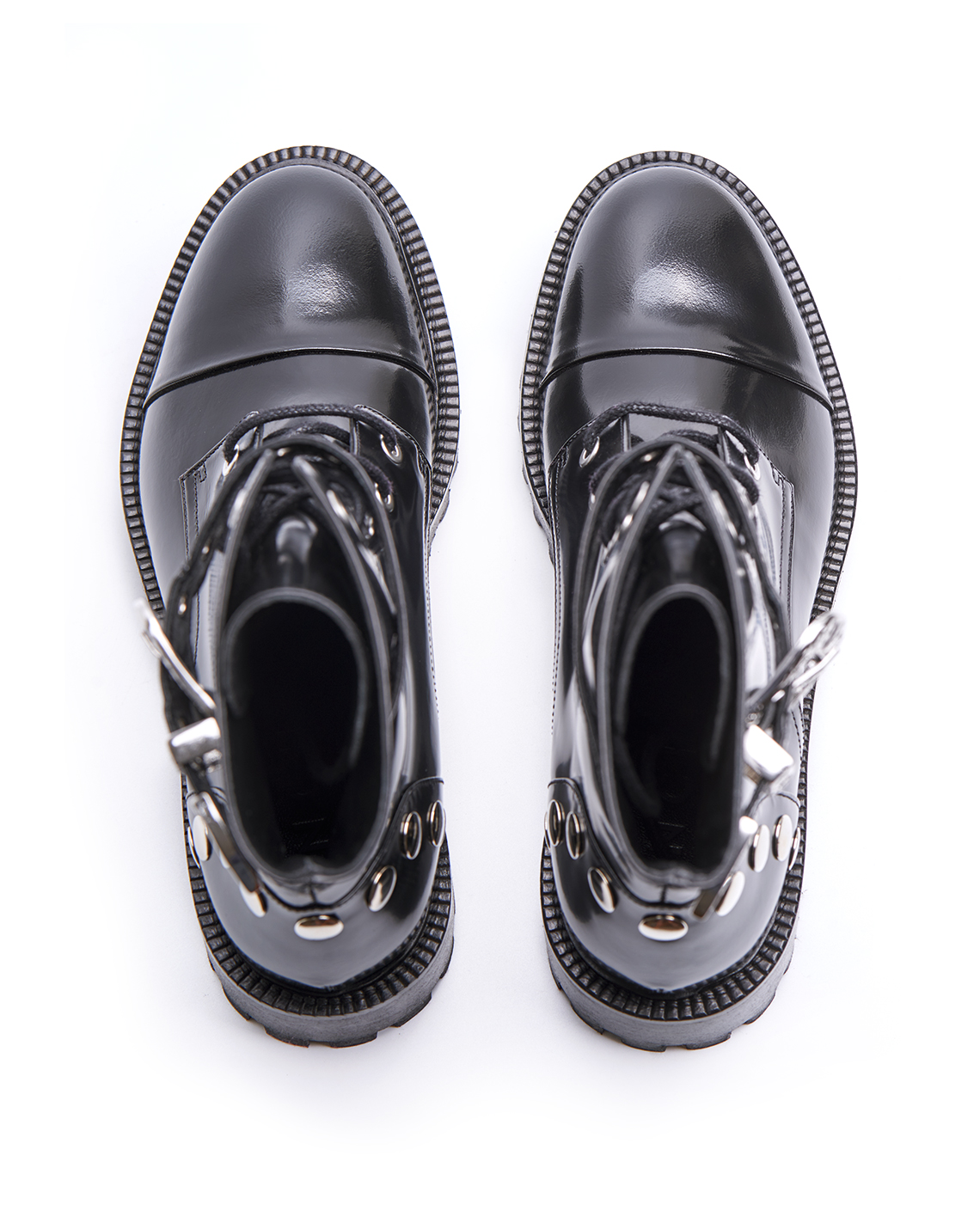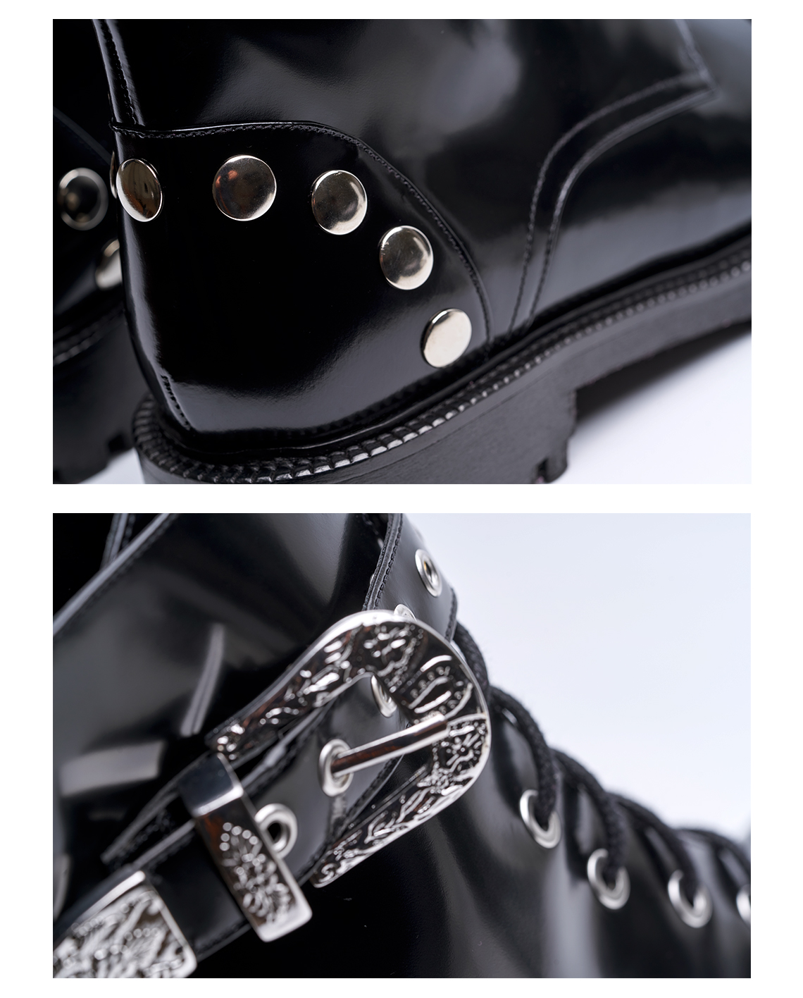 Uninhibited rebellious style is easily nailed with these Western Buckle Ankle Boots. Masterfully crafted from black glossed leather, they feature silver-tone metal buckles and studs, as well as punkish laces for a tough-luxe feel. Let them ground workweek tailoring.